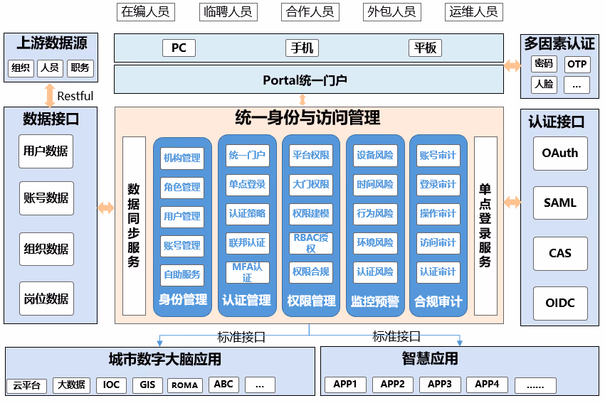 提供各类应用的统一登录入口和集中导航,根据各类应用系统的定位设置安全等级,灵活配置认证方式和访问策略,通过IAM实现各种认证方式(二维码扫描、人脸识别、指纹识别等)的统一编排、调度以及统一会话管理,保障用户的可信访问。